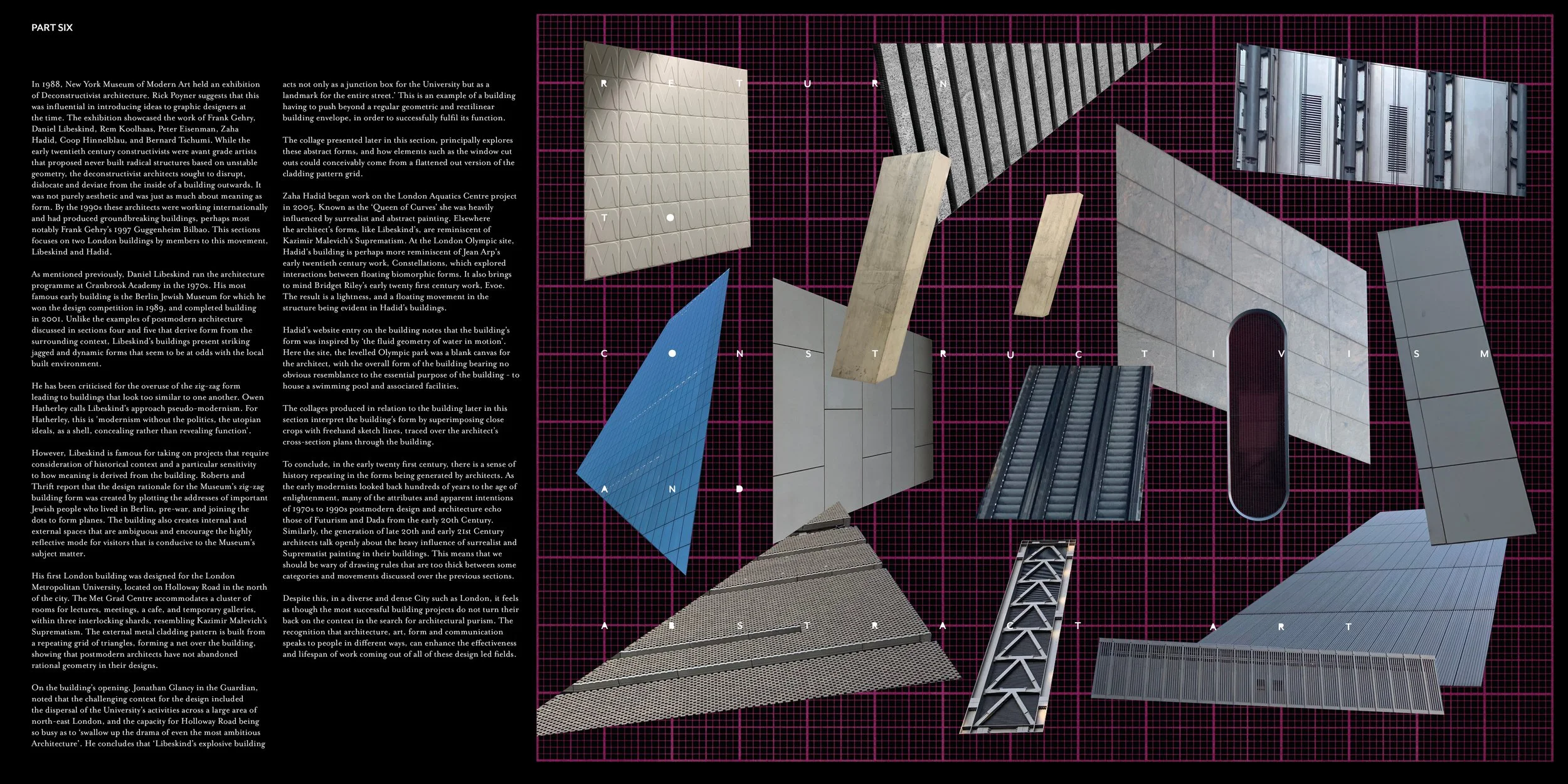 The starting point for the project was research that compared the timelines of overlapping movements in graphic design, art, and architecture over the last century. This exercise helped to inform the creation of a graphic response to the structure of each focus building using a combination of abstract illustration and collage. These images show a map of the western part of London, together with 6 of the images created for the book.