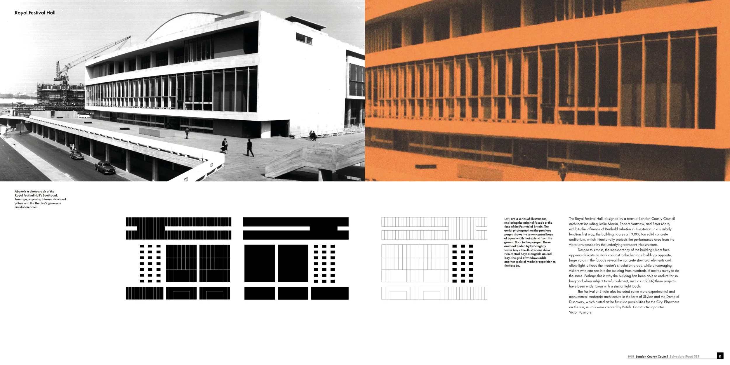 The publication focuses on 12 buildings in London built between 1942 and 2011 that reflect either modernist ideas or post-modern approaches.